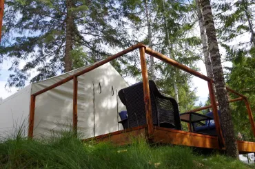 Our popular glamping tents feature river’s edge decks that overlook the rushing rapids of the Nahatlatch River. Each tent comes with single, double or queen beds and sleeps up to 4 – 6 people. You can choose to bring your own linens / sleeping bags or purchase REO’s linens (pillows, sheets, blankets, duvets & towels).