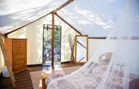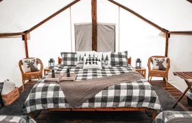 Upgrade to a luxe glamping tent that features additional decor and a king-sized bed. Choose 1 king bed (sleeps 1-2ppl) or 1 king bed and 2 twin beds (sleeps 1-4ppl).